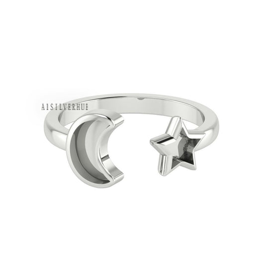 925 Sterling Solid Silver Moon and Star Blank Bezel Adjustable Band Ring Setting, Good for Resin & Ashes Work, Breastmilk/Keepsake DIY Craft