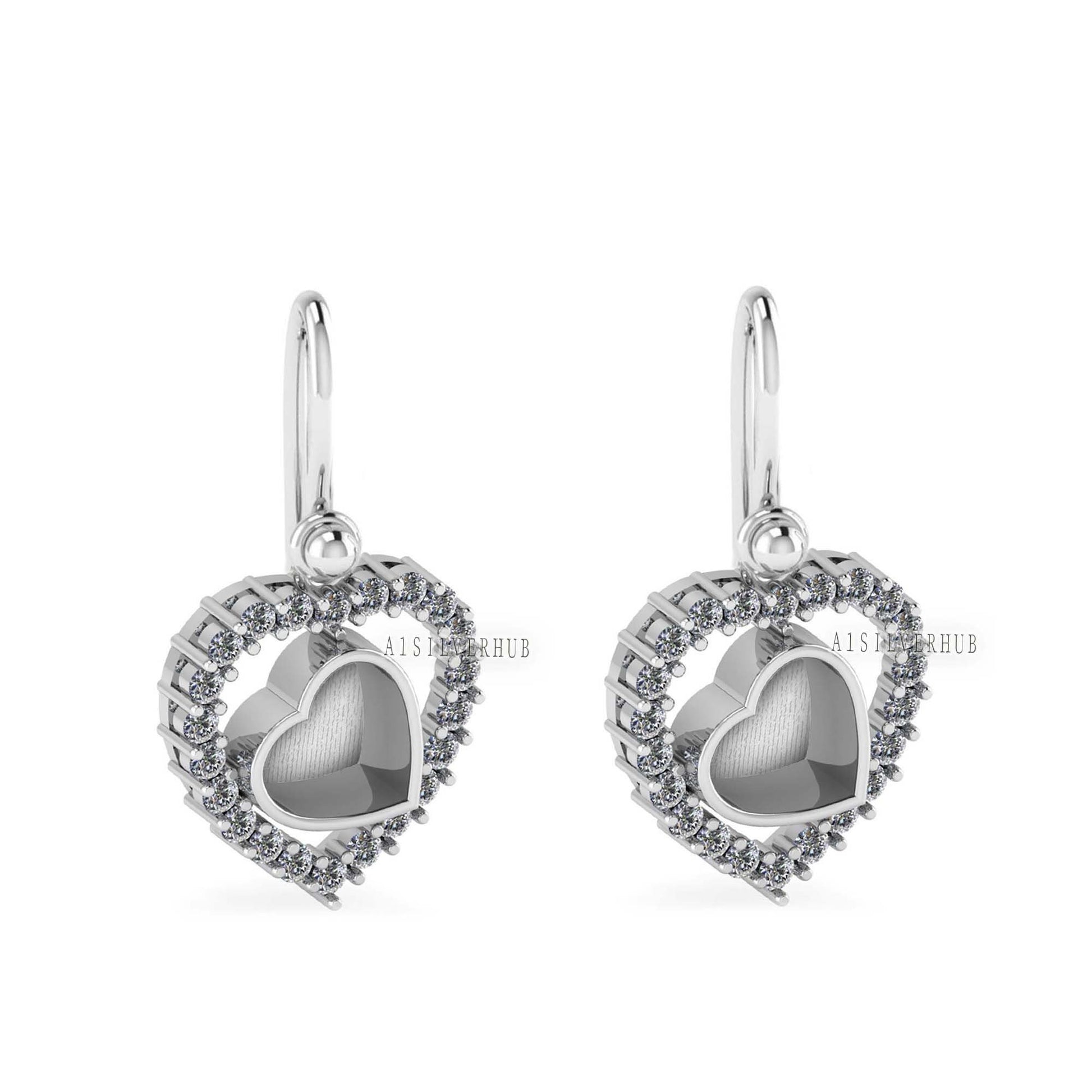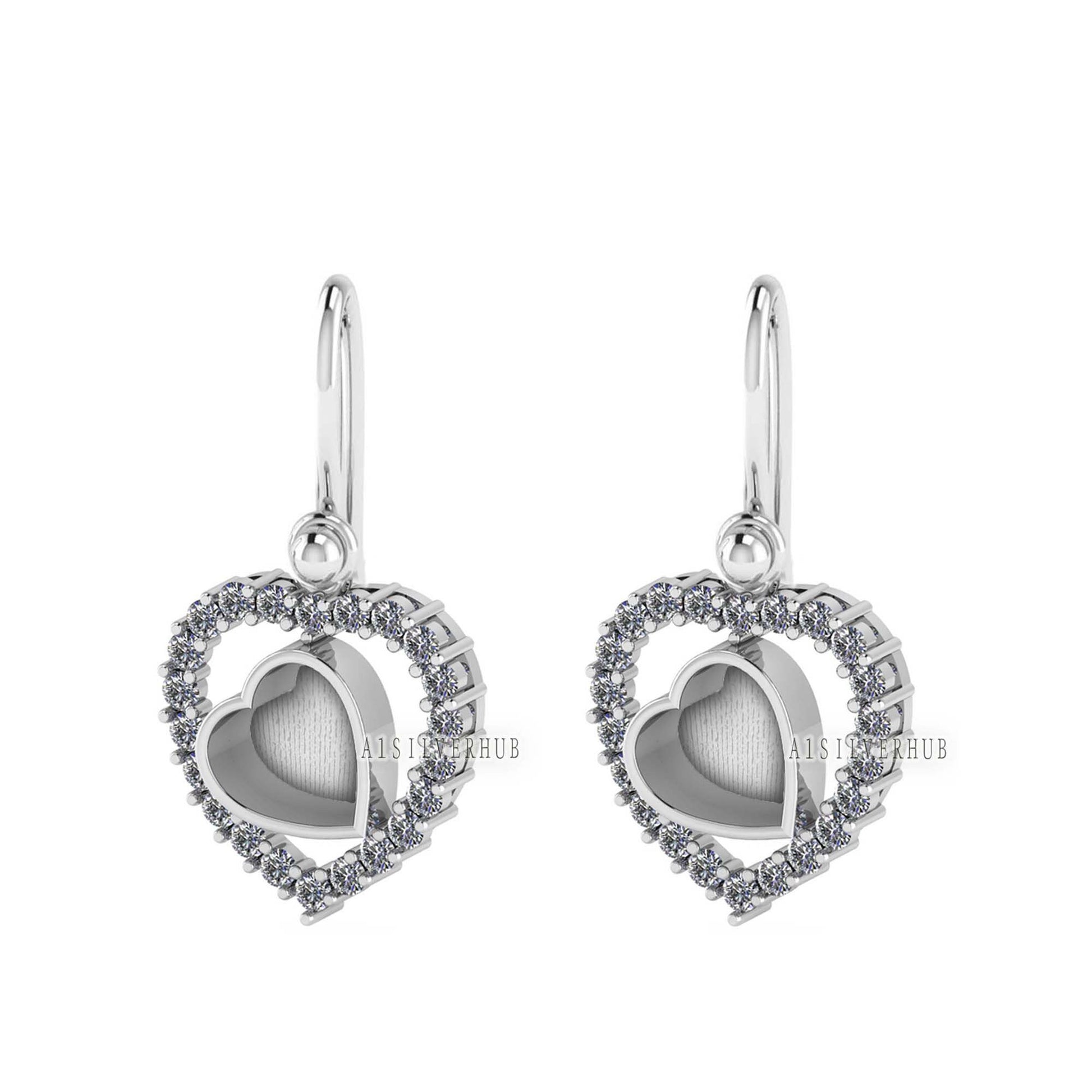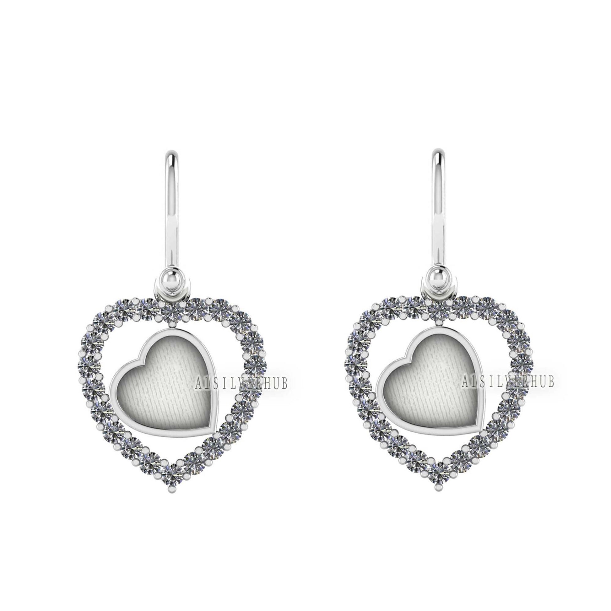 Heart with Zircon Setted 8mm Blank Bezel Dangle Earrings, 925 Sterling Silver, Good for Stone, Resin & Ashes Work, Breast Milk DIY, Keepsake