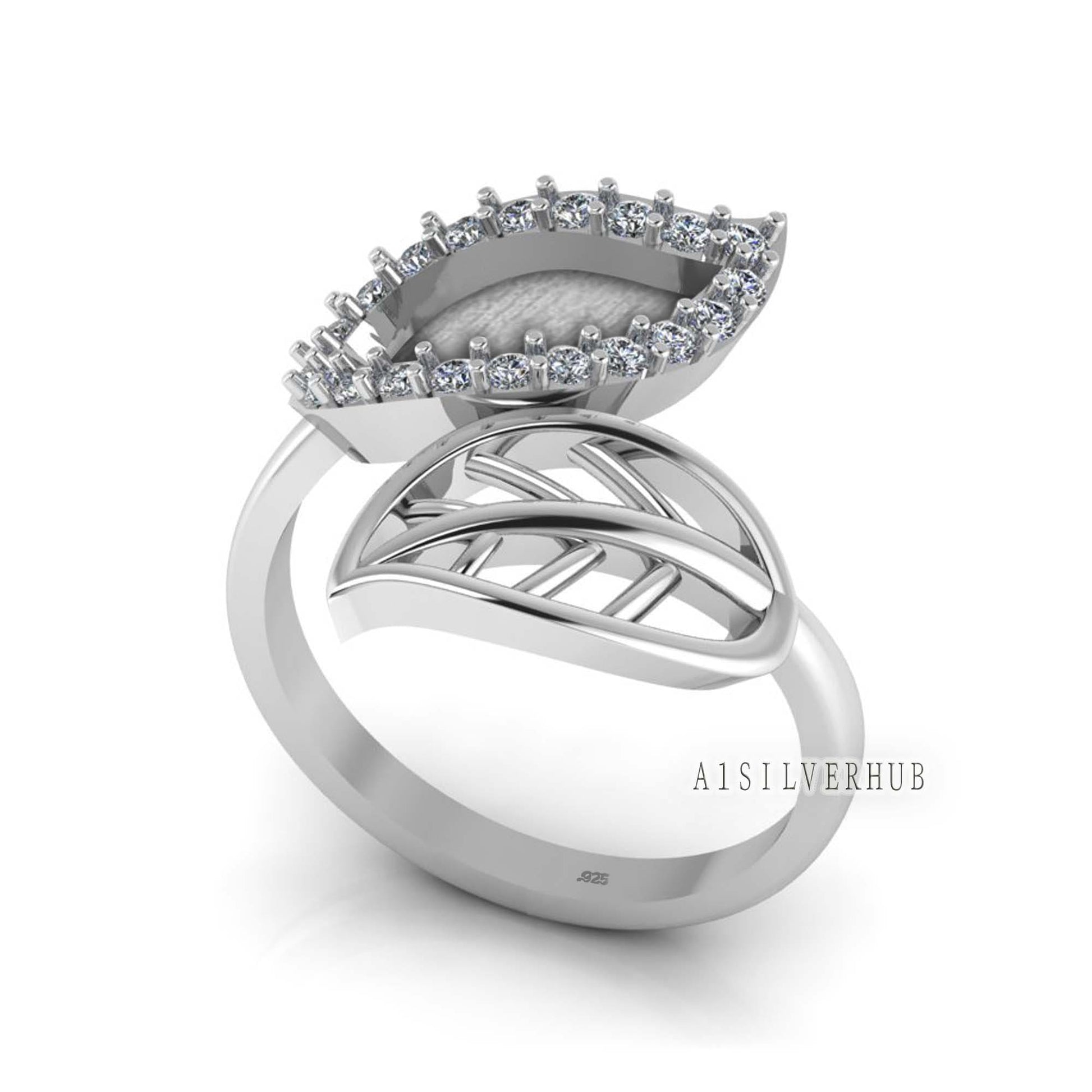925 Sterling Silver Blank Bezel Double Leaf CZ Setted Adjustable Ring, Good For Pour Resin Work, Keepsake/Breastmilk DIY, Memorial Jewelry