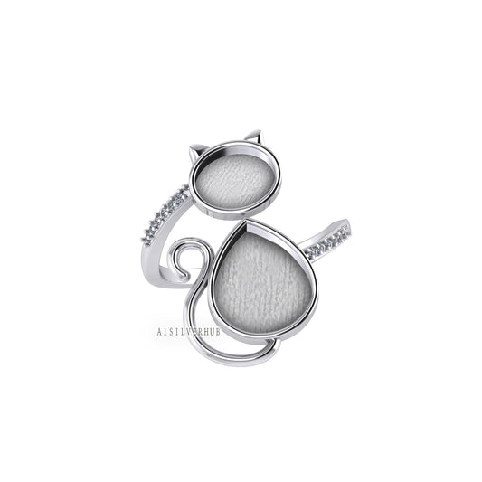 Cat Shape Blank Bezel Adjustable Ring Setting with CZ, 925 Sterling Silver, Cat Lover Ring, Good for Resin & Ashes Keepsake/Breastmilk DIY