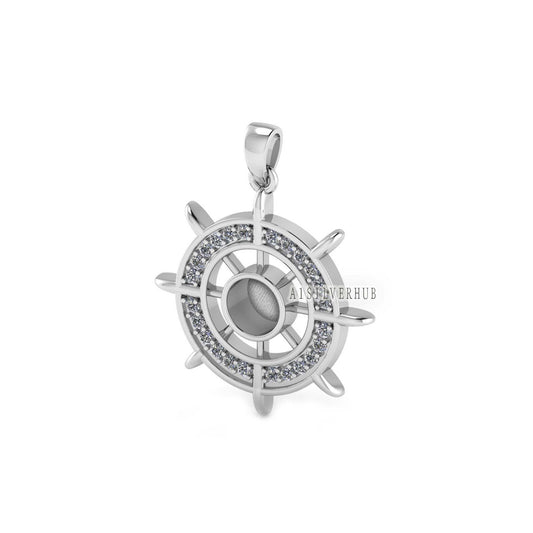 Ocean Helm Ship Steering Wheel 6mm Round Blank Bezel with Zircon Setted, 925 Sterling Silver Pendant, Good for Resin & Ashes, Keepsake DIY