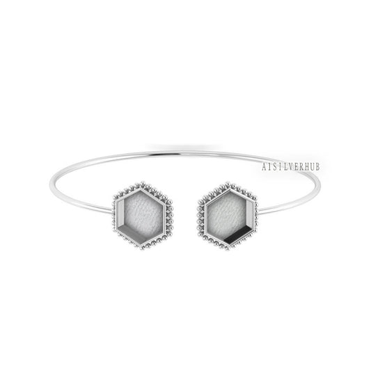 925 Sterling Solid Silver 12mm Hexagon Shape Blank Bezel Adjustable Bracelet/Bangle, Good for Resin & Ashes Work, Keepsake/Breastmilk DIY