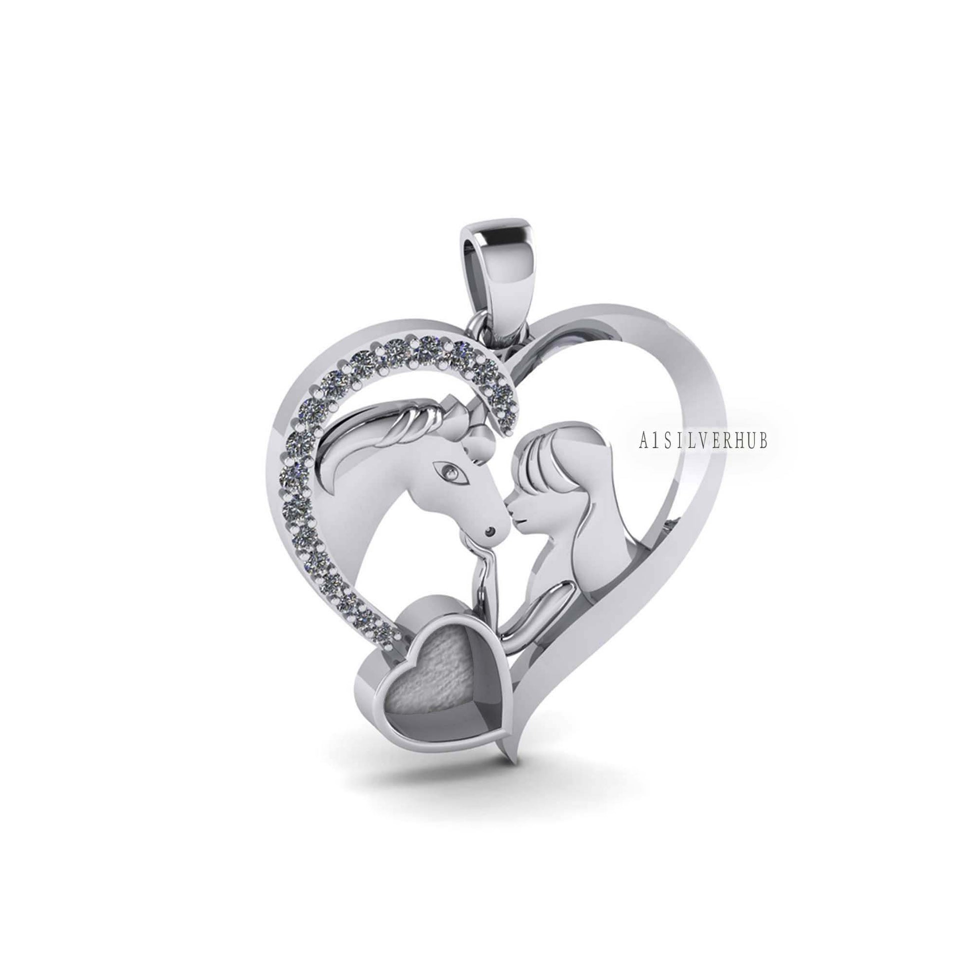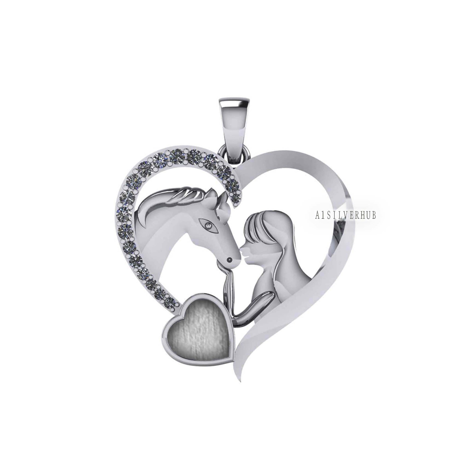 Luxury Girl with Horse Pendant for Women 6mm Blank Heart Zircon Setted, 925 Sterling Silver, Good for Resin & Ashes, Breastmilk/Keepsake DIY