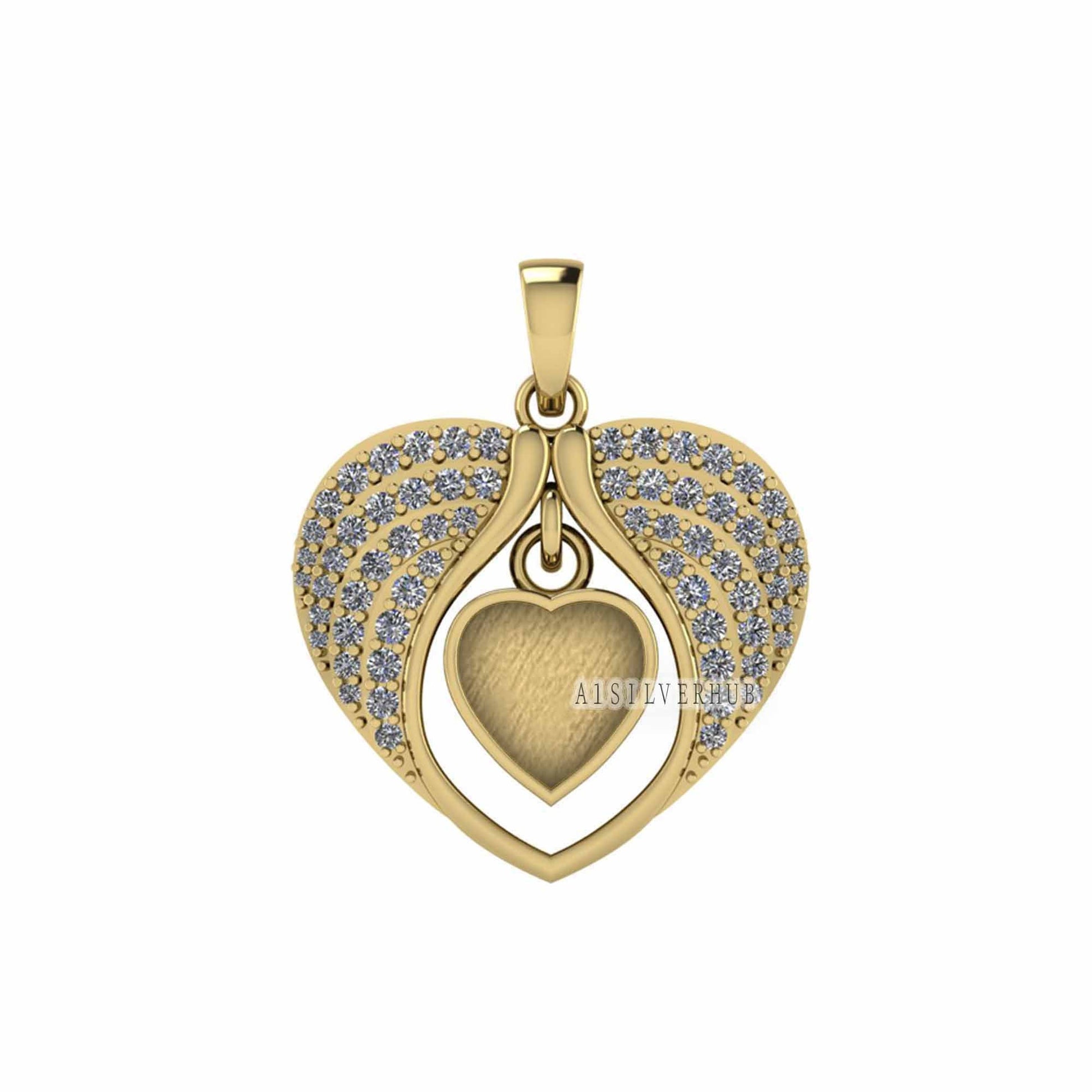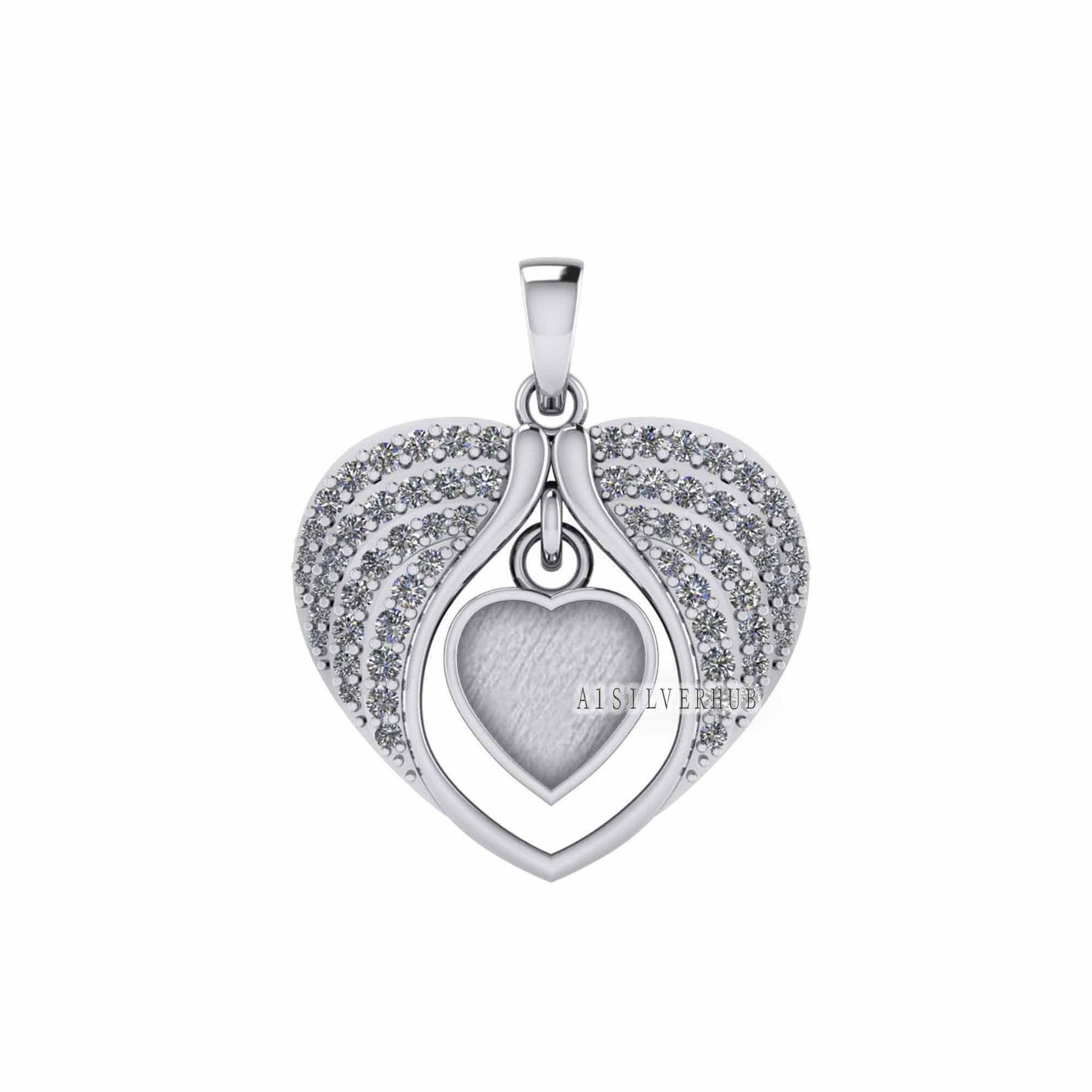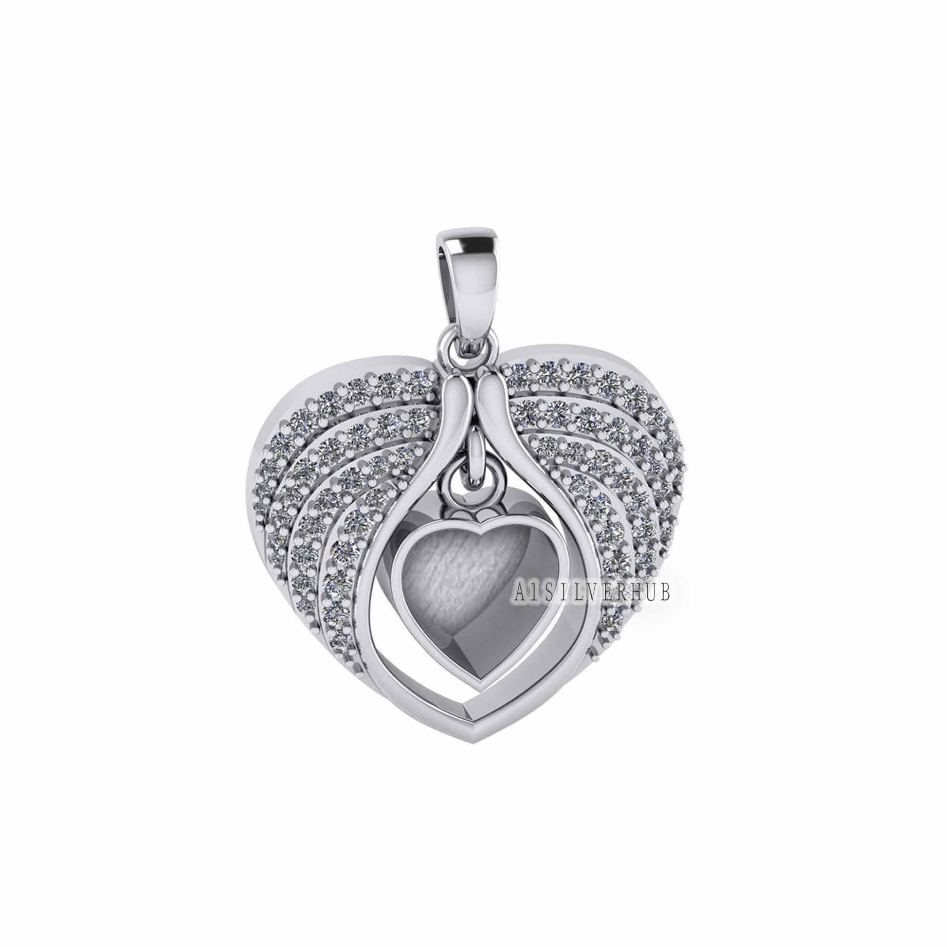 Angel Wings Zircon Setted with Heart Blank Bezel Pendant, 925 Sterling Silver, Good for Crush Opal, Resin & Ashes DIY Work, Keepsake Locket