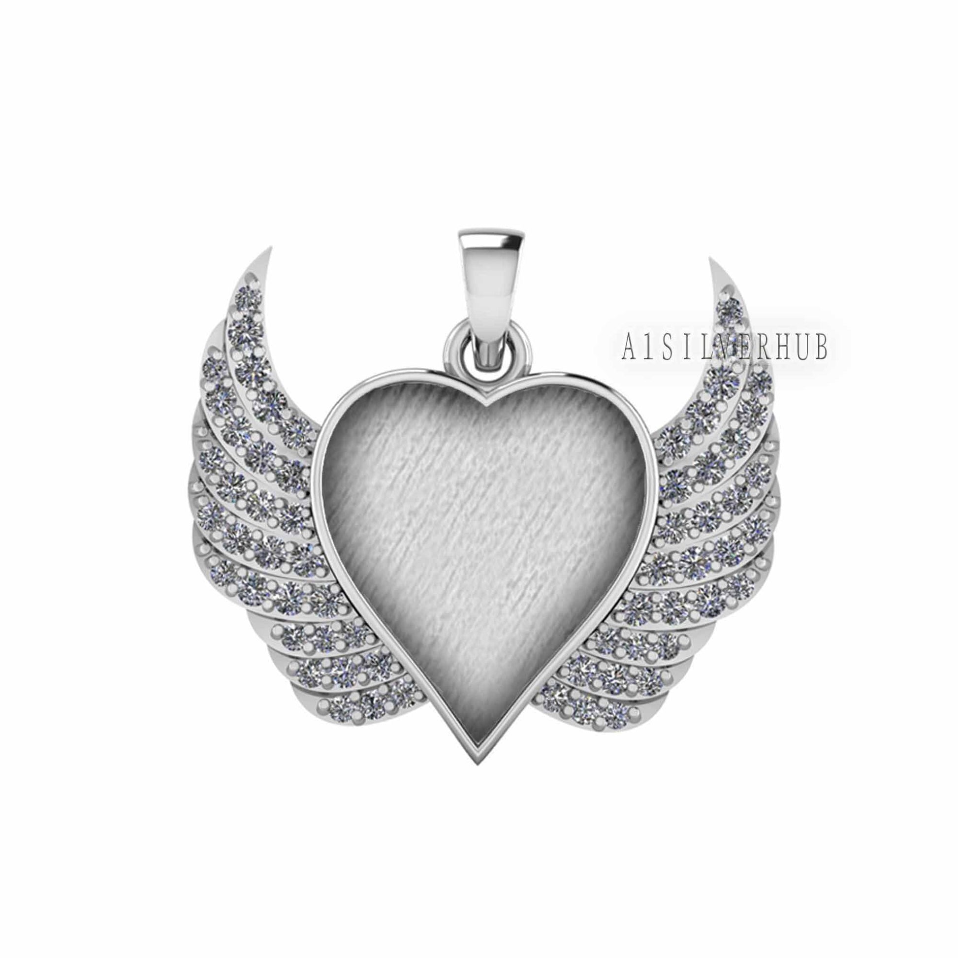 Heart with Angel Wings Zircon Setted Blank Bezel Pendant, 925 Sterling Silver, Good for Crush Opal, Resin & Ashes DIY Work, Keepsake Locket