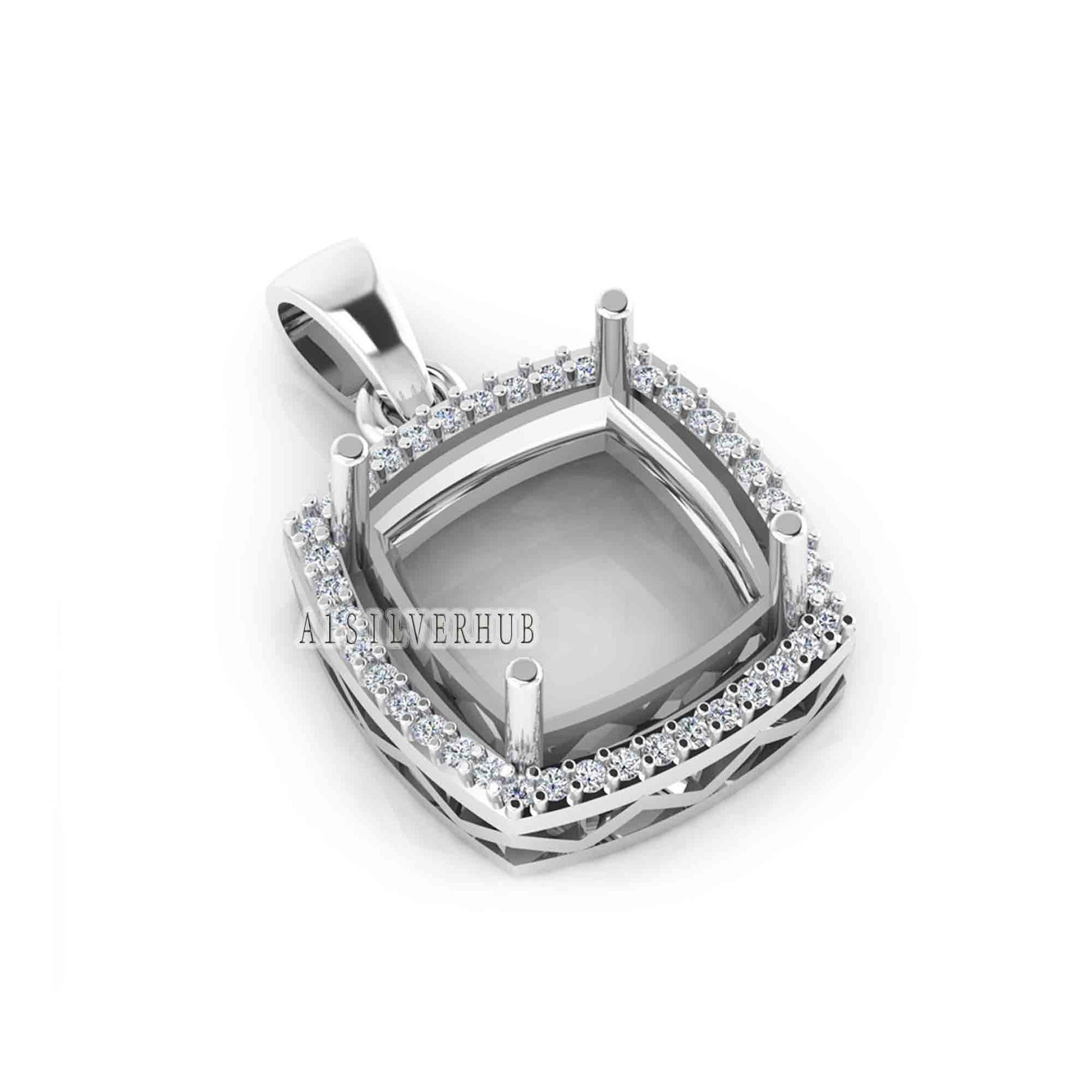 Solitaire Cushion Blank Pre Notched Pendant with Zircon Setted, 925 Sterling Silver Semi Mount Pendant, Good for Gemstone, Memorial Locket