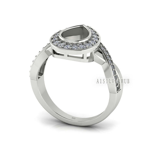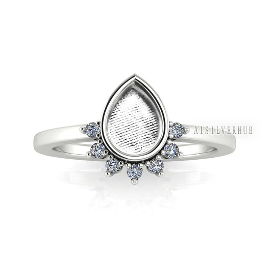 925 Sterling Solid Silver 6x8mm Pear Blank Bezel with Seven CZ Setted Ring,Good for Gemstone, Resin & Ashes Keepsake, Breastmilk DIY Crafts