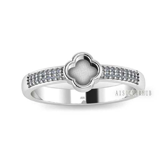 925 Sterling Solid Silver 5mm Clover Blank Bezel with CZ Setted on Band Ring, Good for Resin & Ashes Work, Breastmilk DIY, Keepsake Jewelry