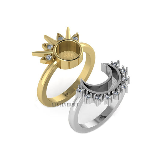 925 Sterling Silver Celestial Pandora Sun/Moon Blank Bezel Ring Set with CZ Setted, Good for Resin & Ashes Work, Keepsake Breastmilk DIY