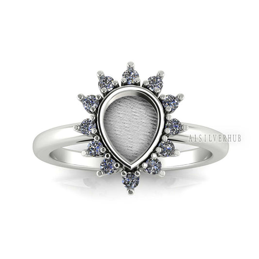 925 Sterling Solid Silver 6x8mm Pear Blank Bezel with CZ Setted Ring, Good for Gemstone, Resin & Ashes Work, Keepsake Breastmilk DIY Crafts
