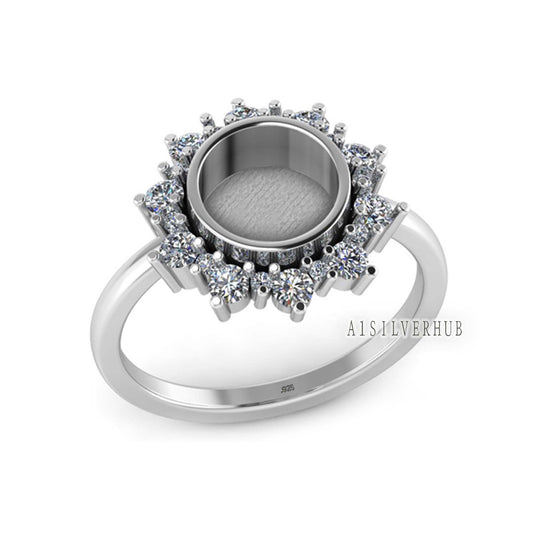 925 Sterling Silver Floral Round Blank Bezel Surrounded CZ Setted Ring Setting, Good for Resin & Ashes Work, Keepsake/Breastmilk DIY Crafts