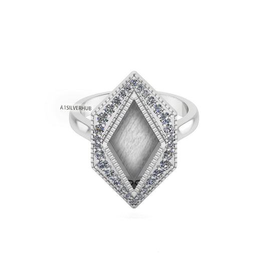 925 Sterling Solid Silver Rhombus Shape 13x8mm Blank Bezel CZ Setted Ring, Good for Gemstone, Resin & Ashes Work, Keepsake Breastmilk DIY