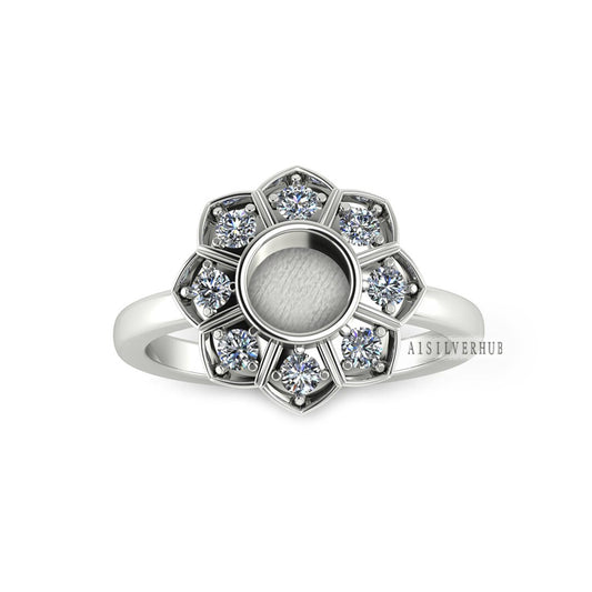 925 Sterling Solid Silver Round 8mm Blank Bezel With CZ Setted Sunflower Ring, Good for Gemstone, Resin & Ashes Work,Keepsake/Breastmilk DIY
