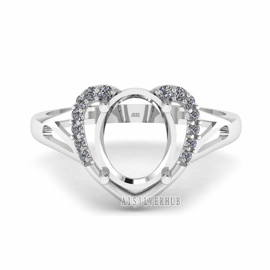 925 Sterling Solid Silver 8x10mm Oval Blank Prong with CZ Setted Heart Ring Setting, For Gemstone, DIY Crafts, Engagement Ring, Gift For Her