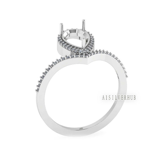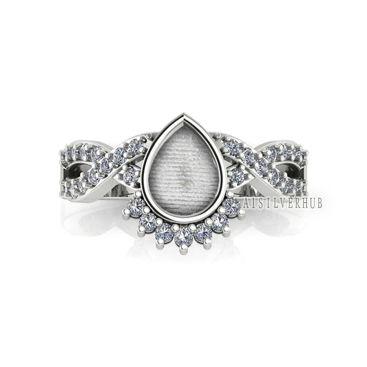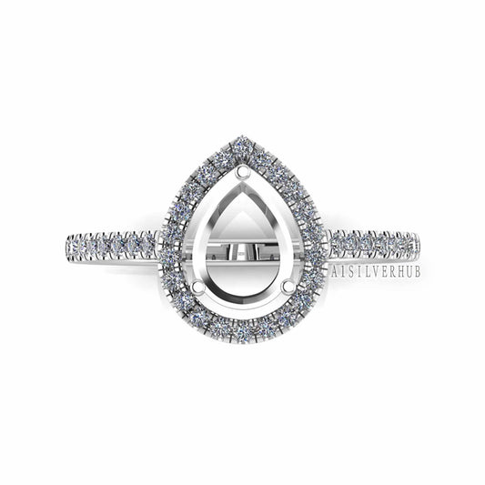 925 Sterling Solid Silver 6x8mm Pear Blank Prong Set with CZ Setted Band Halo Ring Setting, For Gemstone, Keepsake DIY Crafts, Gifts For Her