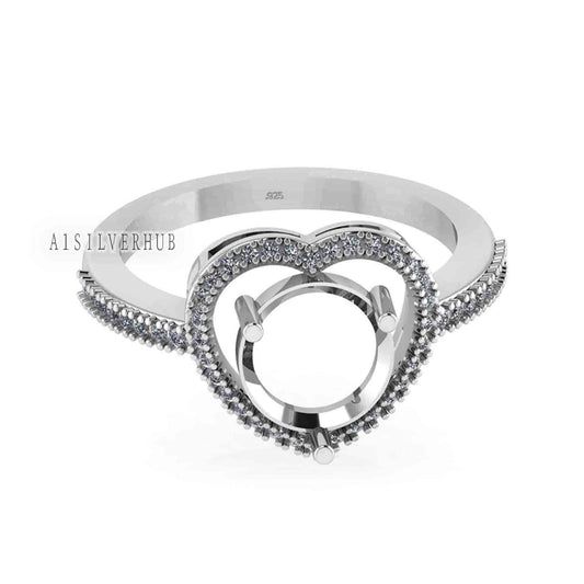 925 Sterling Solid Silver 8mm Round Blank Prong with CZ Setted Heart Ring Setting, For Gemstone, DIY Crafts, Engagement Ring, Gifts For Her