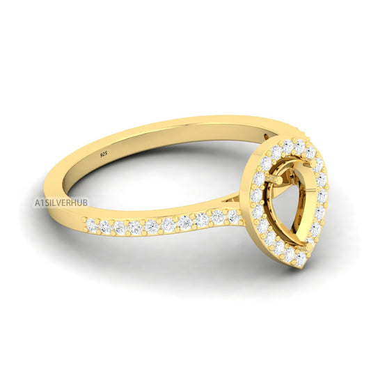 925 Sterling Solid Silver 7x9mm Pear Blank Prong Set with CZ Setted Band Halo Wedding Ring, For Gemstone, Keepsake DIY Crafts, Gifts For Her