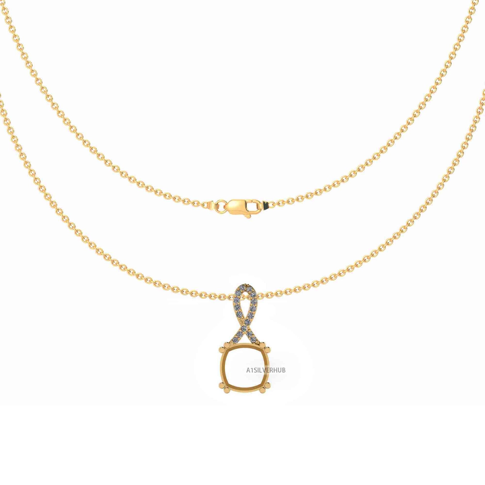 925 Sterling Silver Ribbon Designer Cushion 10x10mm Blank Prong Set Pendant Necklace, Good for Gemstone & CZ Work, DIY Crafts 16''+2'' Chain