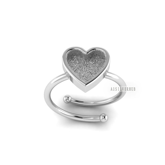 925 Sterling Solid Silver 8mm Heart Shape Blank Bezel Adjustable Ball Band Ring, Good for Resin & Ashes Work, Keepsake Breastmilk DIY Crafts