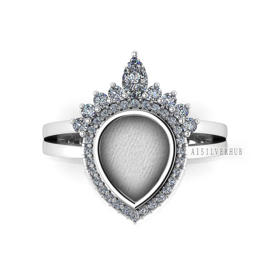 925 Sterling Solid Silver 8x10mm Pear Blank Bezel with CZ Setted Halo Ring, Good for Resin & Ashes Work, Breastmilk/Keepsake, Stackable Ring