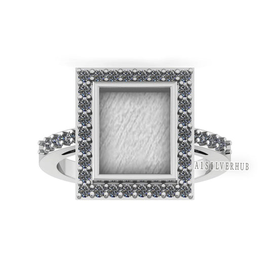 925 Sterling Solid Silver 8x10mm Rectangle Blank Prong Setting with CZ Setted Halo Ring, Good For Gemstone, Keepsake/Breastmilk, DIY Crafts