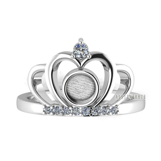 925 Sterling Solid Silver Princess Crown 5mm Round Blank Bezel with CZ Setted Band Ring, Good for Resin & Ashes Work,Keepsake/Breastmilk DIY