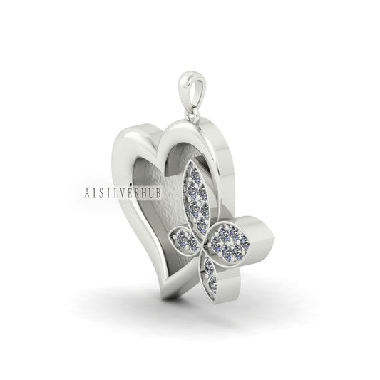 Butterfly in Heart Shape Blank Bezel with CZ Setted, 925 Sterling Silver Pendant Settings, Good for Resin & Ashes Work, Keepsake DIY Crafts